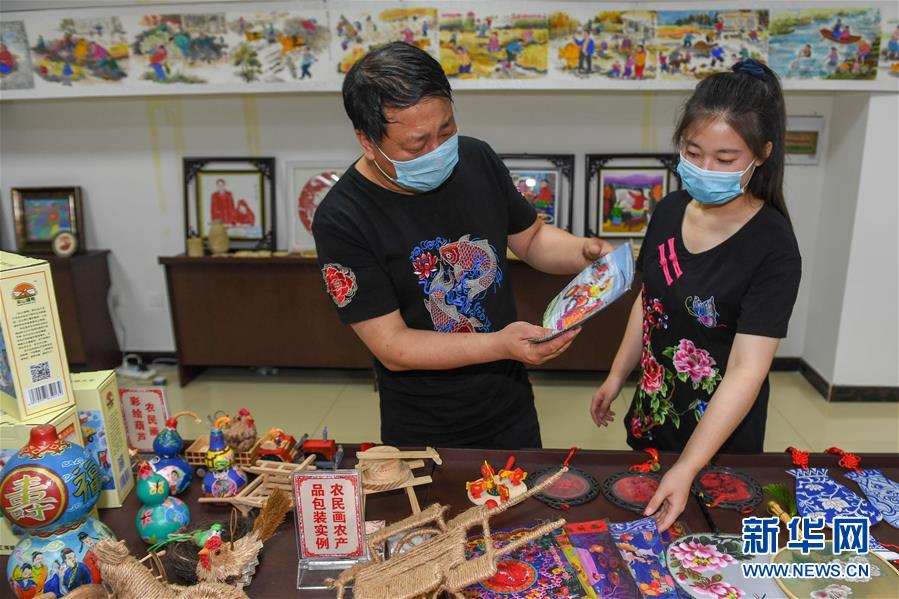 6月25日,在梨树县孤家子镇,农民画传承人钱洪满(左)和女儿钱璐研究农民画文创产品。 新华社记者 张楠 摄