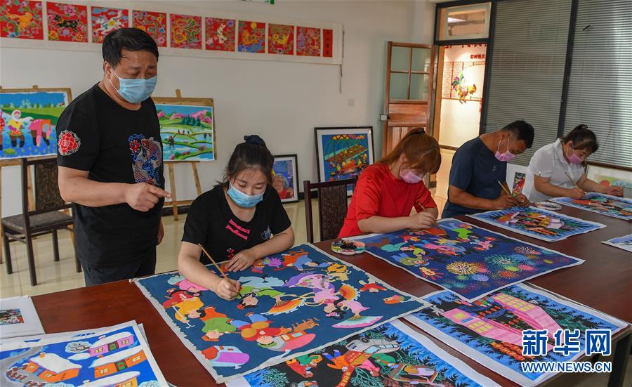 6月25日,在梨树县孤家子镇,农民画传承人钱洪满(左一)指导女儿钱璐创作农民画。 新华社记者 张楠 摄