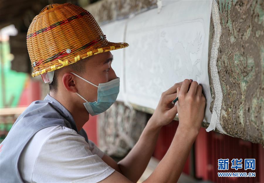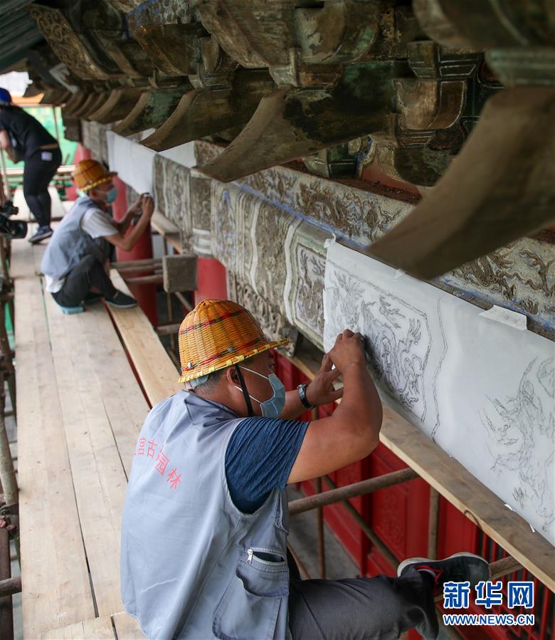 6月30日,工作人员在沈阳故宫进行古建筑油饰彩画保护修复工作。 近日,沈阳故宫开始进行古建筑油饰彩画保护修复二期工程,预计2021年9月下旬竣工。 新华社记者 龙雷 摄