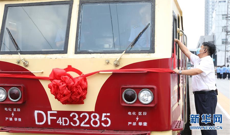 7月1日,列车工作人员为首发列车“戴上”红花。 当日,由辽宁省鞍山市与沈阳铁路旅游集团合作运营的“千山号”鞍山文化旅游列车举行首发仪式。该观光列车集旅游观光、文化体验、休闲娱乐于一体,从辽宁沈阳出发,途经鞍山、海城、岫岩三个旅游目的地,全程近300公里,运行时间5小时。 新华社记者 姚剑锋 摄