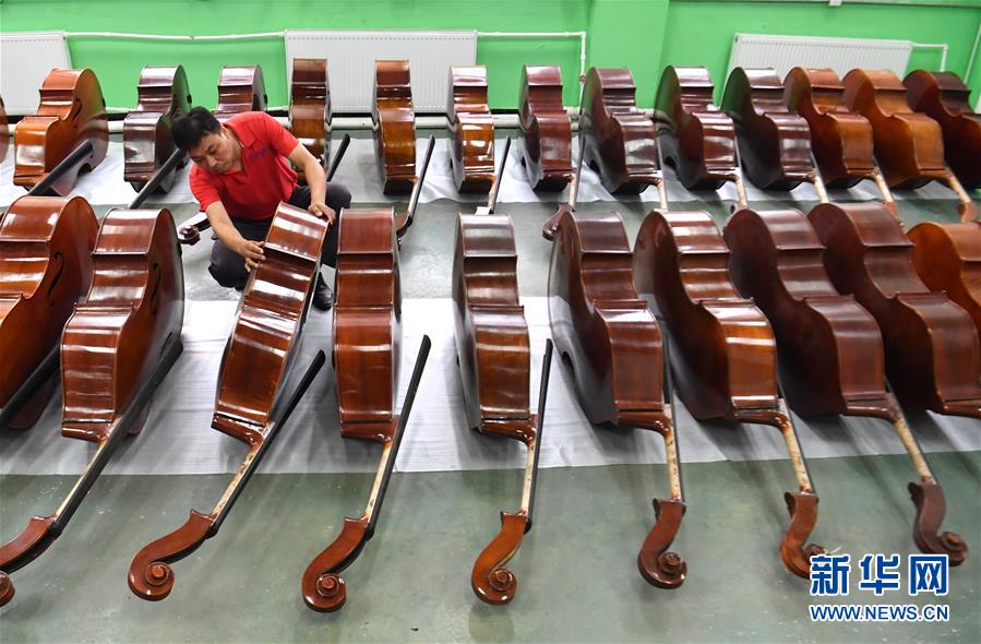 工人在河南驻马店市确山县提琴产业园提琴生产车间检查提琴质量(6月23日摄)。 新华社记者 李嘉南 摄