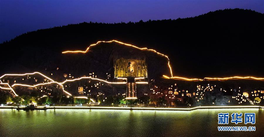 7月7日拍摄的洛阳龙门石窟景区夜景(无人机照片)。 近日,河南洛阳的夜晚愈发缤纷多彩。立足于厚重的隋唐文化底蕴,洛阳正通过创新夜游产品打响“古都夜八点”品牌,激活文旅消费。 新华社记者 李安 摄