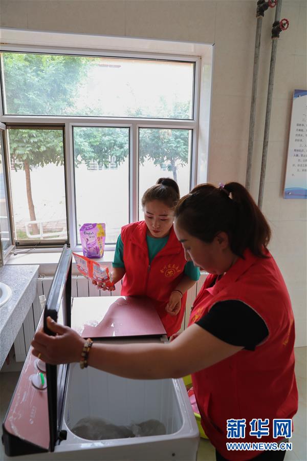 7月11日,在甘肃省金昌市金川区双湾镇新粮地村,“好媳妇先锋队”为行动不便的老人清洗床单被套。 新华社发(杜哲宇摄)