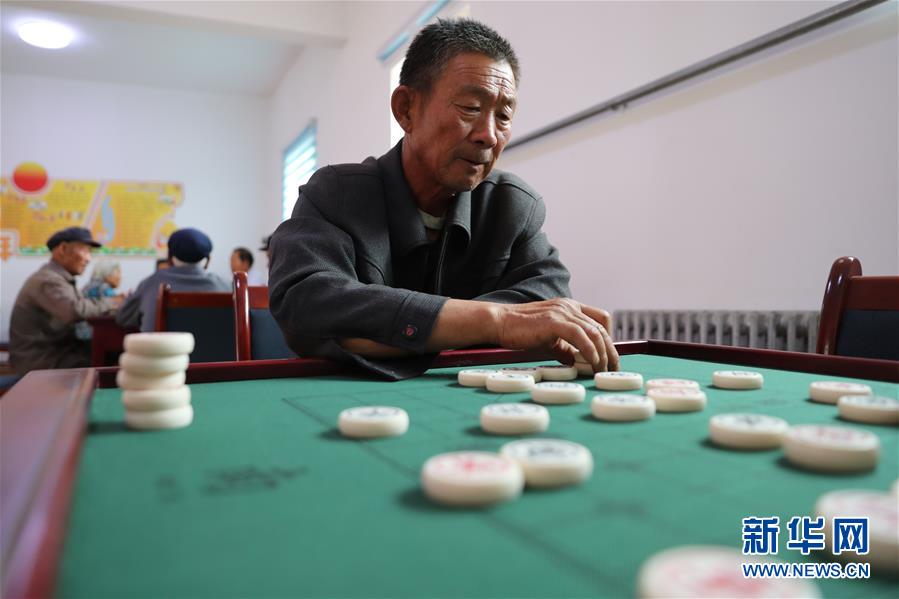 7月11日,在甘肃省金昌市金川区双湾镇新粮地村,63岁的鲜开军在活动室下棋。新华社发(杜哲宇摄)