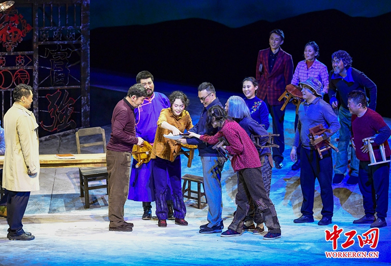 2020年7月13日,内蒙古自治区艺术院团首次“草原文艺为民演出季”在位于呼和浩特的乌兰恰特大剧院拉开帷幕。首场演出的话剧《红手印》由内蒙古民族艺术剧院乌力格尔蒙古剧团排演,讲述了扶贫干部带领村民走上产业脱贫道路的真实感人故事。图片作者:王正/视觉中国