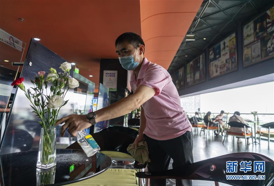 7月20日,昆明市北辰财富中心影院一名保洁人员对观众候场区的桌椅进行消毒。 新华社发(陈欣波 摄)