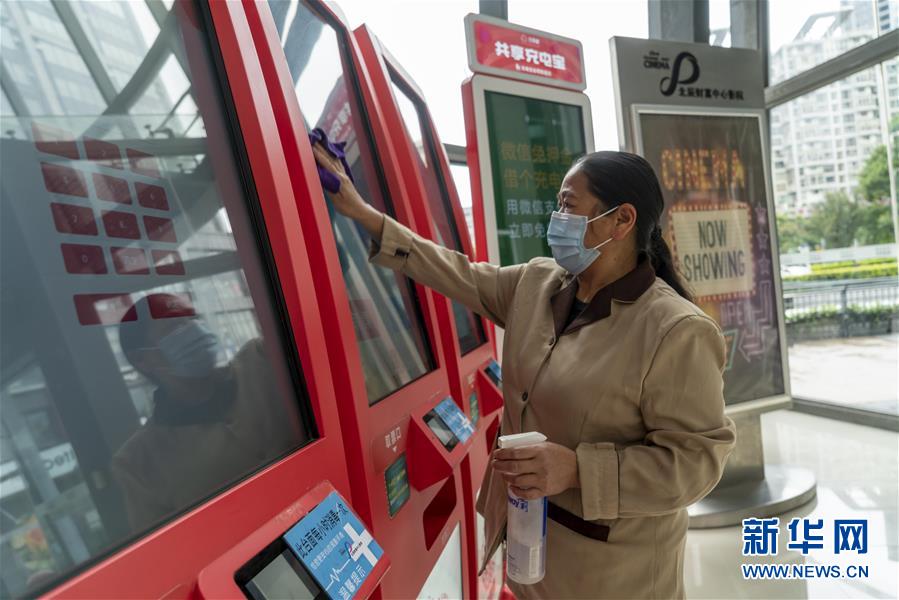 7月20日,昆明市北辰财富中心影院一名保洁人员对取票机进行消毒擦拭。新华社发(陈欣波 摄)
