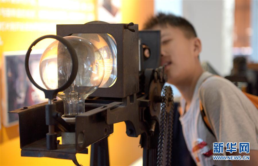 2019年8月29日,参观者在西影电影艺术体验中心参观展出的老式幻灯机。当日,陕西省西安市西影电影艺术体验中心正式对外开放。 新华社记者 刘潇 摄