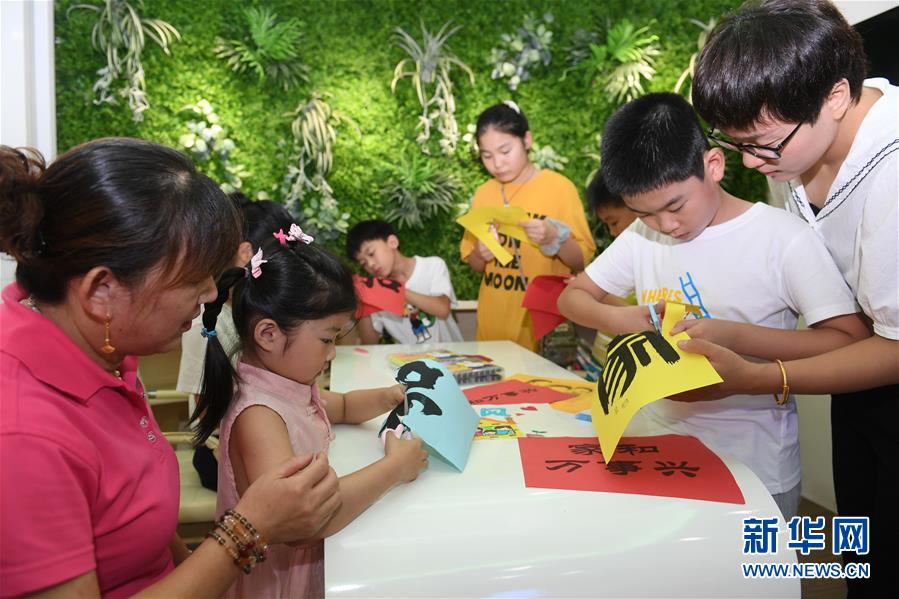 7月21日,家长带着小朋友在安定书院社区“好人馆”制作家风主题剪纸。 当日,浙江省湖州市吴兴区爱山街道安定书院社区开展“听爷爷奶奶讲家风”活动,让社区的青少年了解家风文化。 新华社记者 翁忻旸 摄