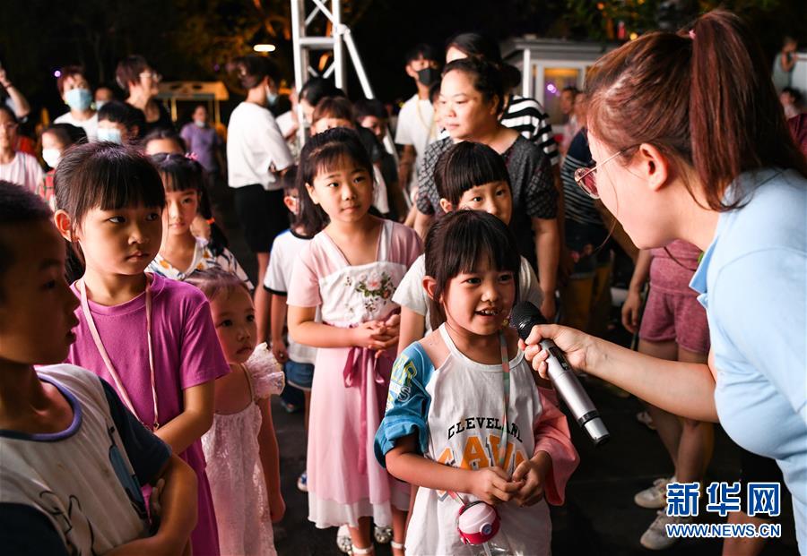 7月23日晚,在成都市成华区望平街滨河路的天府文创大集市上,参加读书活动的小朋友在介绍自己阅读过的童话故事。 近日,天府文创大集市活动在成都全市范围内开展,以成都原创IP为主的优秀文创产品集体亮相夜幕下的成都街头。据了解,本次天府文创大集市共分为七个会场,以“读书、纳凉、赏文创——盛夏中的新消费”为主题,将持续到7月26日。 新华社记者 王曦 摄