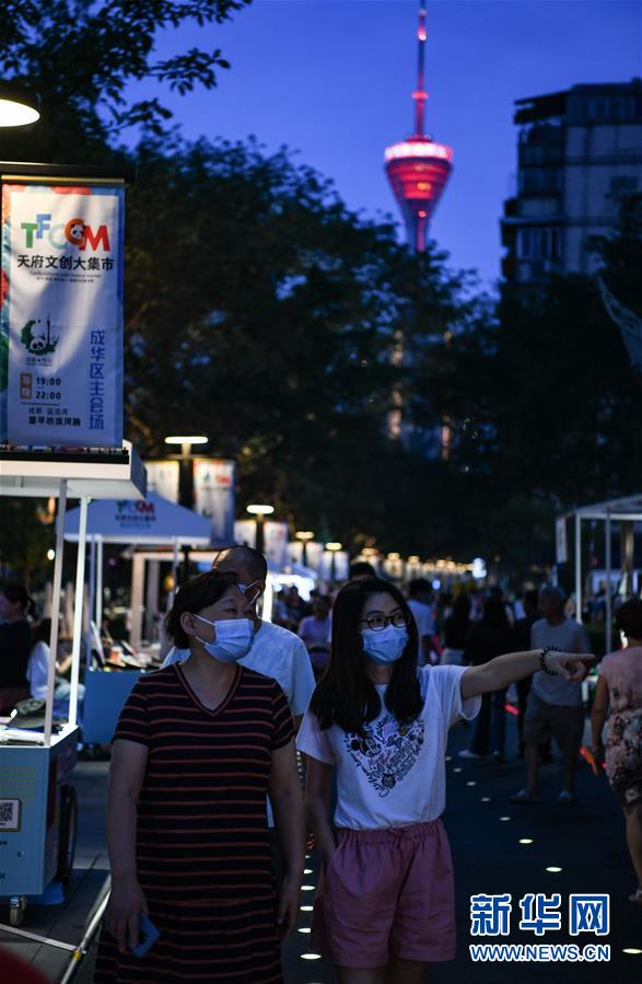 7月23日晚,市民在成都市成华区望平街滨河路的天府文创大集市上游玩。 近日,天府文创大集市活动在成都全市范围内开展,以成都原创IP为主的优秀文创产品集体亮相夜幕下的成都街头。据了解,本次天府文创大集市共分为七个会场,以“读书、纳凉、赏文创——盛夏中的新消费”为主题,将持续到7月26日。 新华社记者 王曦 摄