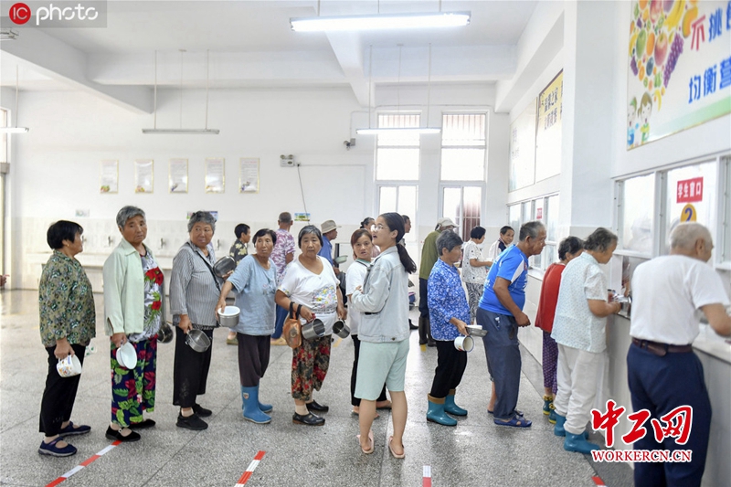 2020年7月28日,村民在安徽省巢湖市烔炀镇中心小学安置点食堂排队打饭。图片署名: 李远波/IC photo