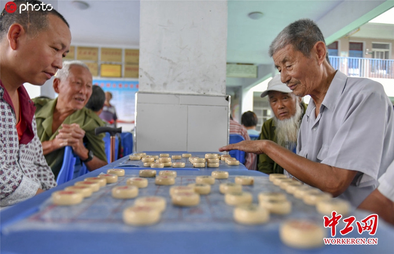 2020年7月28日,村民在安徽省巢湖市烔炀镇中心小学安置点食堂吃饭。图片署名: 李远波/IC photo