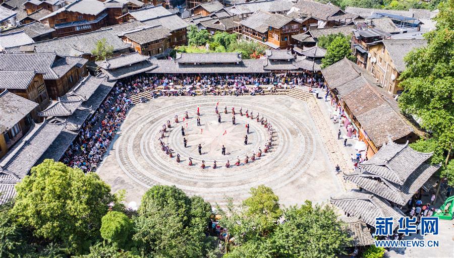 7月31日,游客在雷山县西江千户苗寨景区观看歌舞表演(无人机照片)。 夏日时节的贵州省雷山县西江千户苗寨风光秀美,吸引游客前来观光游玩。 新华社记者 陶亮 摄