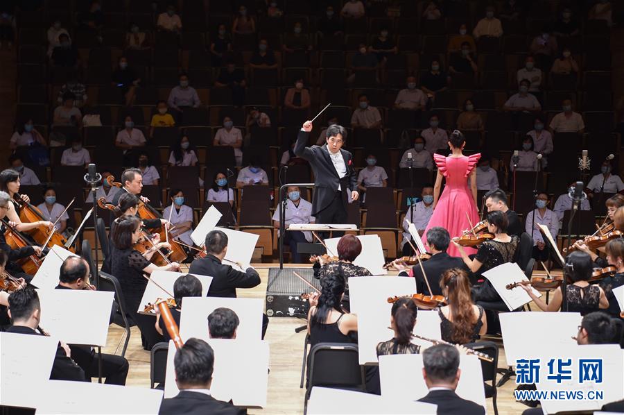 8月1日,“民生之夜——《我爱你中国》大型交响音乐会”在天津大剧院音乐厅举行,拉开了复工复产后天津市音乐类剧场演出的帷幕。 新华社发(孙凡越 摄)