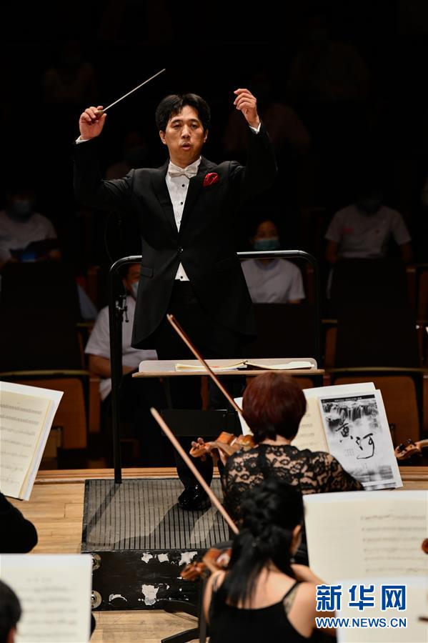 8月1日,在天津大剧院音乐厅,指挥家董俊杰在指挥乐团演出。 当日,“民生之夜——《我爱你中国》大型交响音乐会”在天津大剧院音乐厅举行,拉开了复工复产后天津市音乐类剧场演出的帷幕。 新华社发(孙凡越 摄)