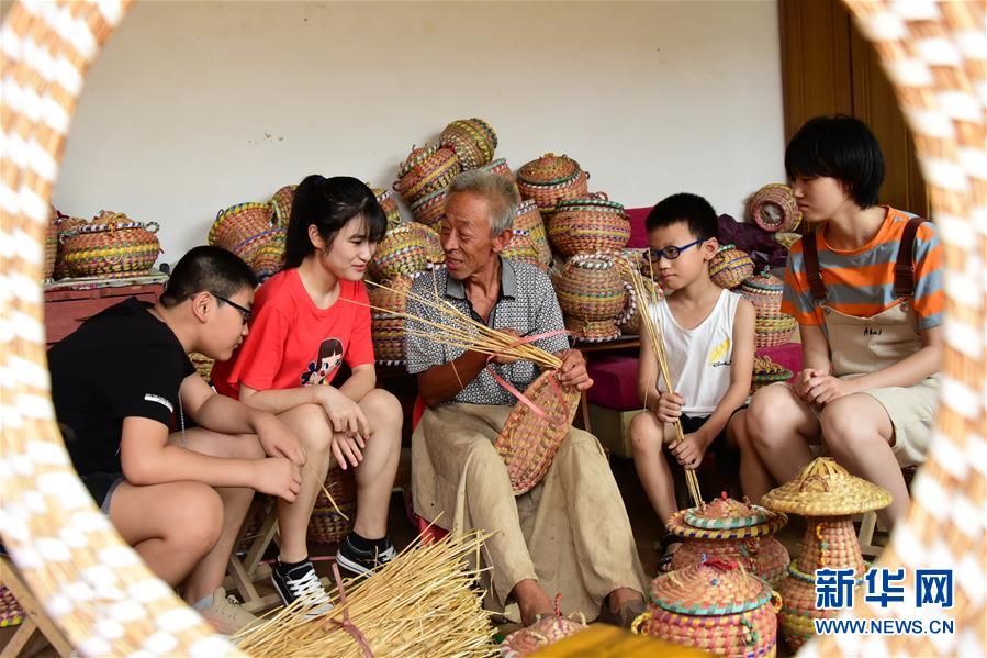 8月2日,杨振国在家中向小朋友介绍草编技艺。 新华社记者 朱旭东 摄