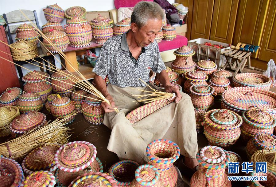 8月2日,杨振国在家中编制草编工艺品。 新华社记者 朱旭东 摄