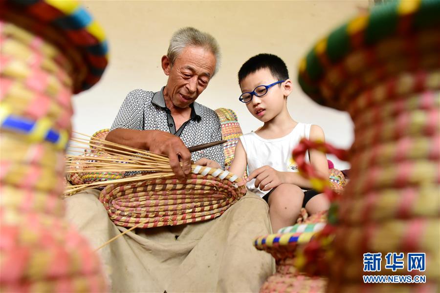 8月2日,杨振国在家中向小朋友介绍草编工艺品。 新华社记者 朱旭东 摄