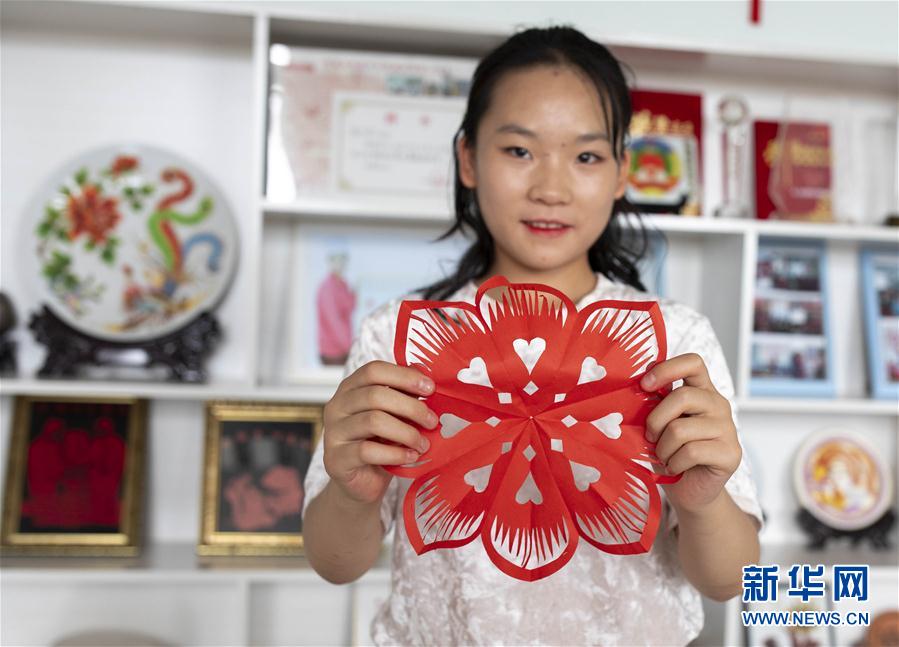 8月2日,宁夏吴忠市利通区永昌社区手工培育坊内,小学生展示自己的剪纸作品。 新华社记者 杨植森 摄
