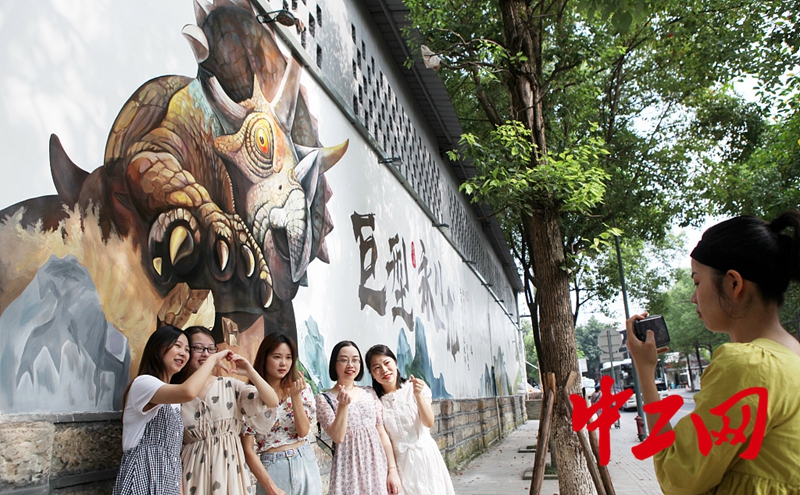 2020年8月3日,市民在重庆市永川区南大街街道小桥子社区新泰路沿线“上游永川龙”、“宝峰龙”、“巨型永川龙”以及“功夫熊猫”3D艺术墙绘前留影,成为永川新的网红打卡点。图片来源:陈仕川/视觉中国
