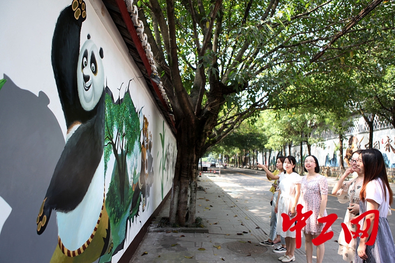 2020年8月3日,市民在重庆市永川区南大街街道小桥子社区新泰路沿线“上游永川龙”、“宝峰龙”、“巨型永川龙”以及“功夫熊猫”3D艺术墙绘前留影,成为永川新的网红打卡点。图片来源:陈仕川/视觉中国