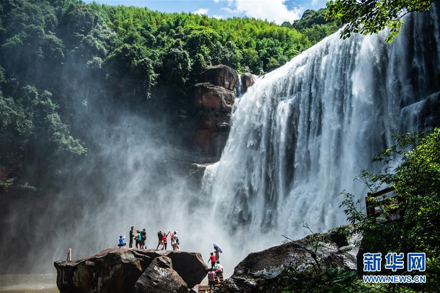 游客在位于贵州省赤水市的赤水大瀑布景区游玩(6月15日摄)。 新华社记者 陶亮 摄