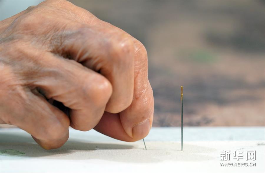 在开封市素花宋绣工艺有限公司的展示馆里,王素花在刺绣(7月30日摄)。新华社记者李嘉南摄