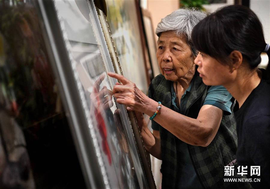 在开封市素花宋绣工艺有限公司的展示馆里,王素花向徒弟刘冬红讲解刺绣作品上的难点(7月30日摄)。新华社记者李安摄