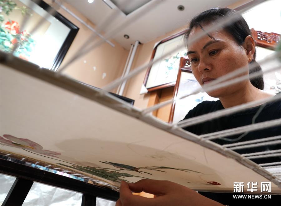 在开封市素花宋绣工艺有限公司的展示馆里,王素花的徒弟刘冬红在刺绣(7月30日摄)。新华社记者李嘉南摄