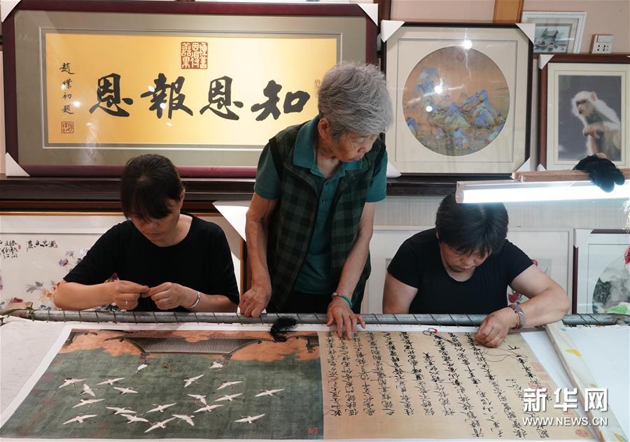 在开封市素花宋绣工艺有限公司的展示馆里,王素花(中)在指导徒弟们刺绣(7月30日摄)。新华社记者李嘉南摄