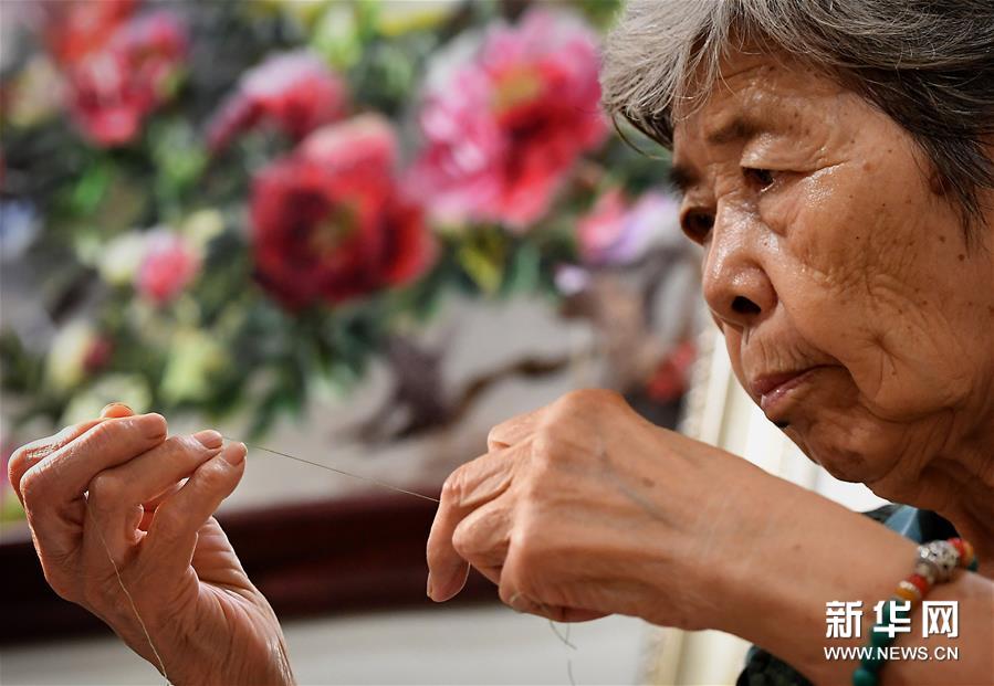 在开封市素花宋绣工艺有限公司的展示馆里,王素花在劈线(7月30日摄)。新华社记者李安摄