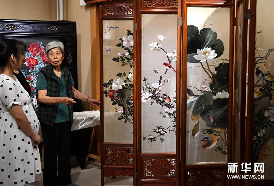在开封市素花宋绣工艺有限公司的展示馆里,王素花向徒弟讲解自己刺绣作品上的针法(7月30日摄)。新华社记者李安摄