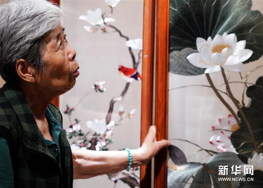 在开封市素花宋绣工艺有限公司的展示馆里,王素花在观看自己的刺绣作品(7月30日摄)。新华社记者李嘉南摄