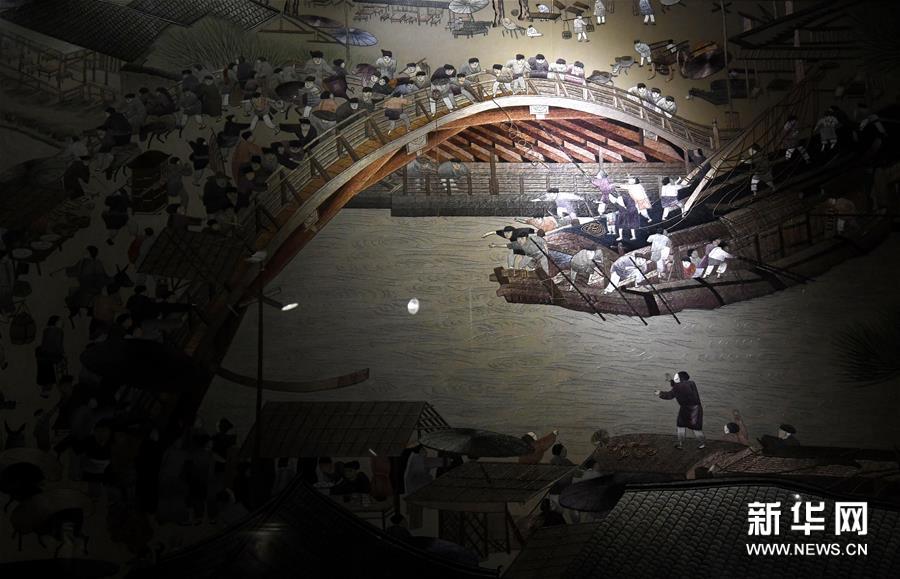 这是王素花和徒弟们新近绣制的《清明上河图》局部(7月30日摄)。新华社记者李嘉南摄