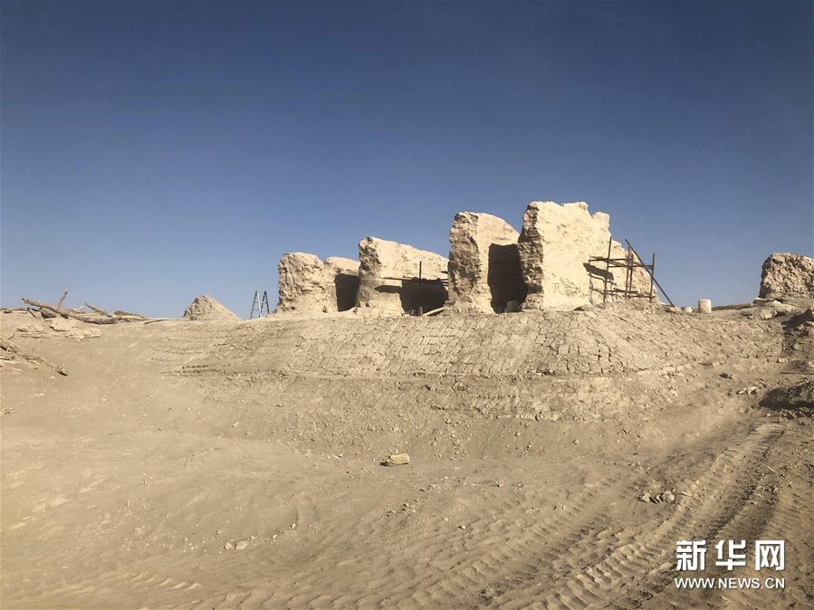 这是抢险加固中的楼兰古城三间房遗址(7月27日摄,手机照片)。新华社发(中铁西北科学研究院有限公司提供)