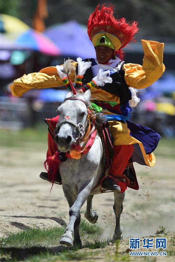 西藏曲水县热堆村村民在赛马(8月6日摄)。 连日来,西藏曲水县农牧民身着盛装,开展赛马、赛牦牛等活动,欢度“望果”节。西藏农区“望果节”是一个在青稞麦田成熟之际,祈求丰收的节日,据传有1500多年的历史,是国家级非物质文化遗产。藏语“望”意为“田地”,“果”为“转圈”。因各地青稞成熟时间不一,“望果节”时间也各异。 新华社发(索朗罗布 摄)