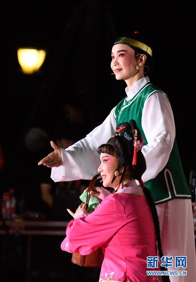 8月8日,越剧演员在湖州状元街表演。 当日,浙江省湖州市吴兴区爱山街道在历史文化街区状元街举办以“繁华爱山 缤纷悦夜”为主题的文旅生活节。活动包括文化创意消费市集、文艺演出、放映露天电影等,吸引了众多市民。 新华社记者 黄宗治 摄