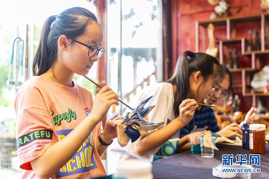 8月9日,贵州省安顺市第一高级中学的学生在安顺市傩雕文化博物馆为傩戏面具上色。新华社发(陈熙 摄)