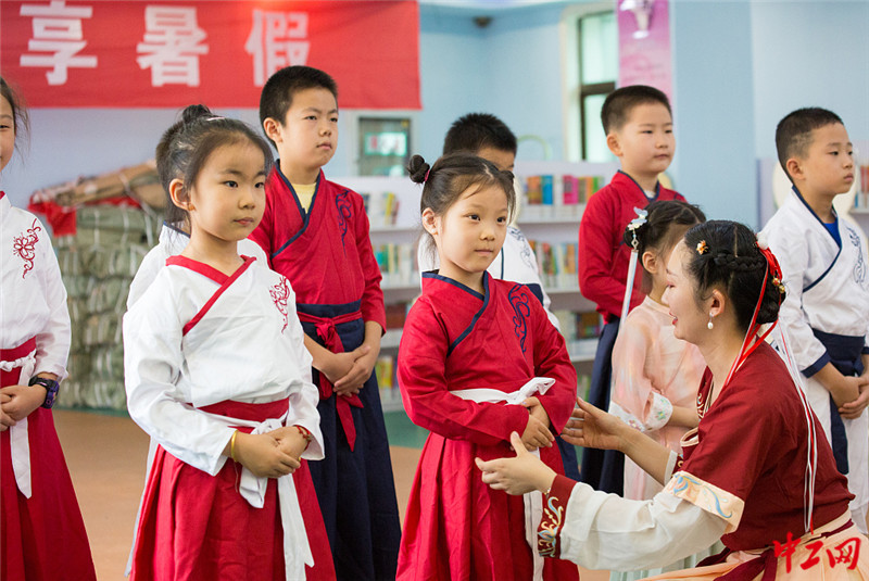 2020年8月10日,江苏南通,在如皋市少儿图书馆内,小读者身穿汉服学习汉服礼仪。徐慧/视觉中国