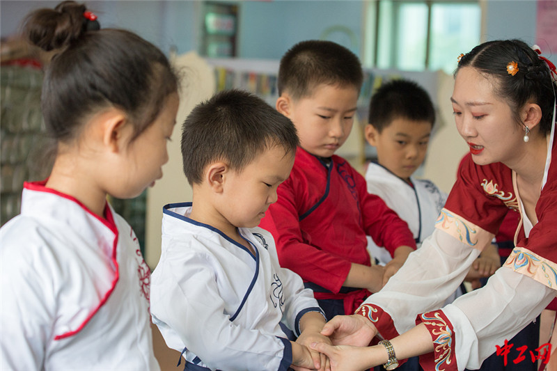 2020年8月10日,江苏南通,在如皋市少儿图书馆内,小读者身穿汉服学习汉服礼仪。徐慧/视觉中国