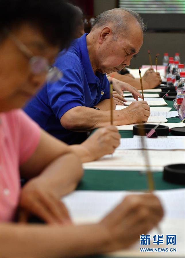 8月13日,陕西师范大学退休教师郭祖仪(右)书写录取通知书。 当日,陕西师范大学2020年手写录取通知书正式开笔。该校自2007年起采用毛笔书写录取通知书的方式,为新生传递佳音。今年,学校十余位退休教师、在职教师、校友代表等书法爱好者将为约4500名新录取的本科生送上带着墨香的大学录取通知书。 新华社记者 张博文 摄