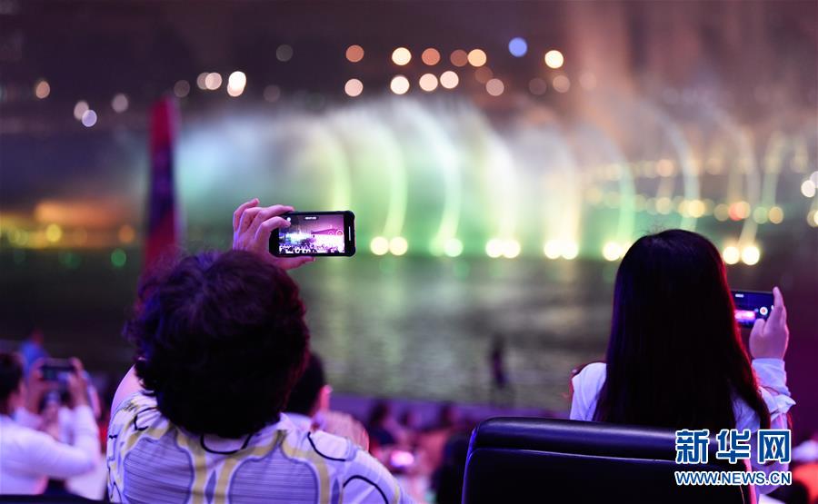 8月17日,在天津大剧院平台剧场,观众在听音乐会的同时欣赏喷泉表演。 当日,“同心·绽放—京津冀交响乐艺术发展联盟大型交响音乐会”在天津大剧院平台剧场举行,这也是天津大剧院举办的首场大型户外交响音乐会。 本次户外交响音乐会由著名指挥家李飚指挥,小提琴演奏家吕思清携手京津冀三地交响乐团共同演奏。这也是天津大剧院停工近200天之后为观众带来的一场视觉与听觉的文化盛宴。 新华社发(孙凡越 摄)