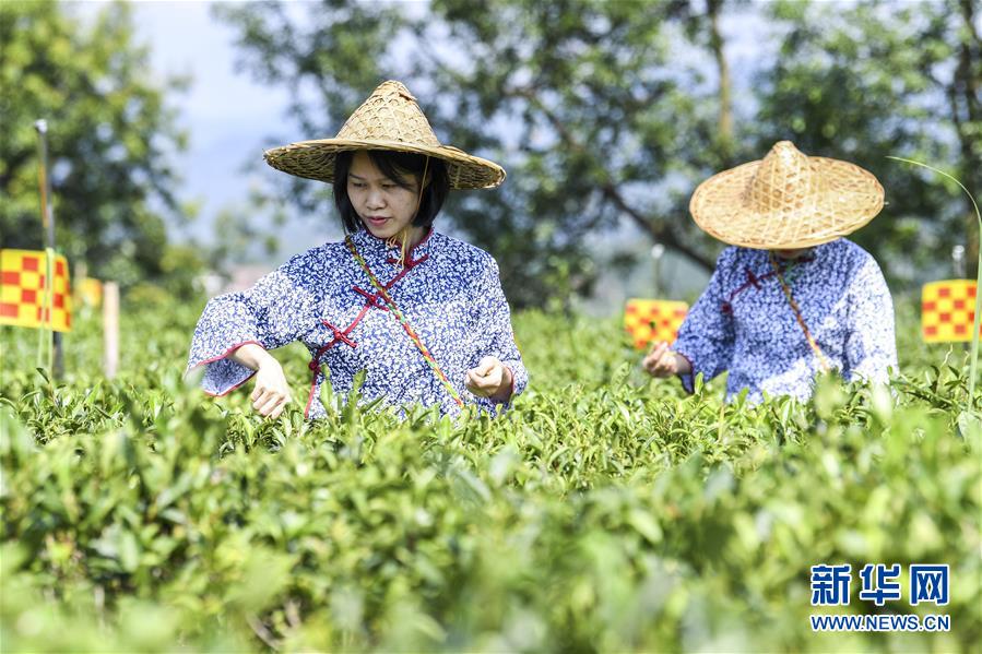 两名采茶姑娘在广西梧州市苍梧县六堡镇一处茶园内采摘茶叶(7月29日摄)。