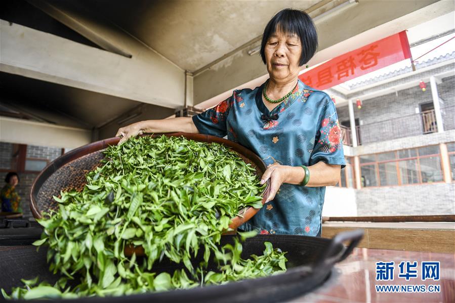 在广西梧州市苍梧县六堡镇黑石山茶厂,六堡茶制作技艺传承人韦洁群在加工茶叶(7月29日摄)。 新华社记者 曹祎铭 摄