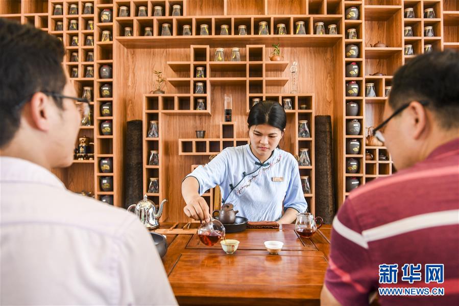 广西梧州市一家茶厂的工作人员在给外来的茶叶采购客商倒茶(7月29日摄)。 新华社记者 曹祎铭 摄