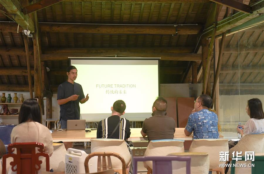 8月22日,图书馆创始人、设计师张雷(站立者)向来访者介绍图书馆情况。新华社记者 翁忻旸 摄