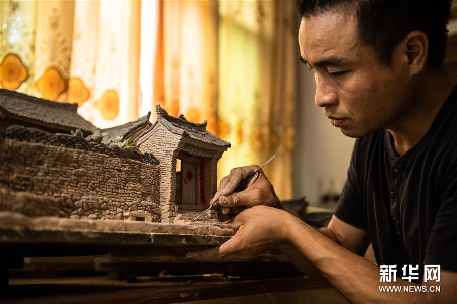 黄简松对土陶民居模型进行加工(8月28日摄)。新华社记者 陶亮 摄
