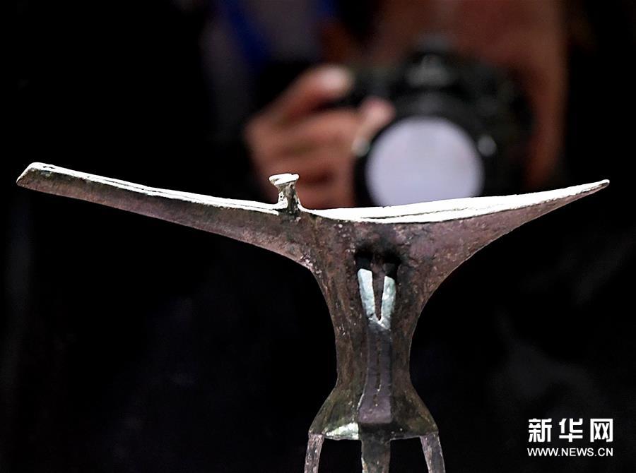 参观者在二里头夏都遗址博物馆拍摄展品“乳钉纹铜爵”(2019年10月19日摄)。 新华社记者 李安 摄