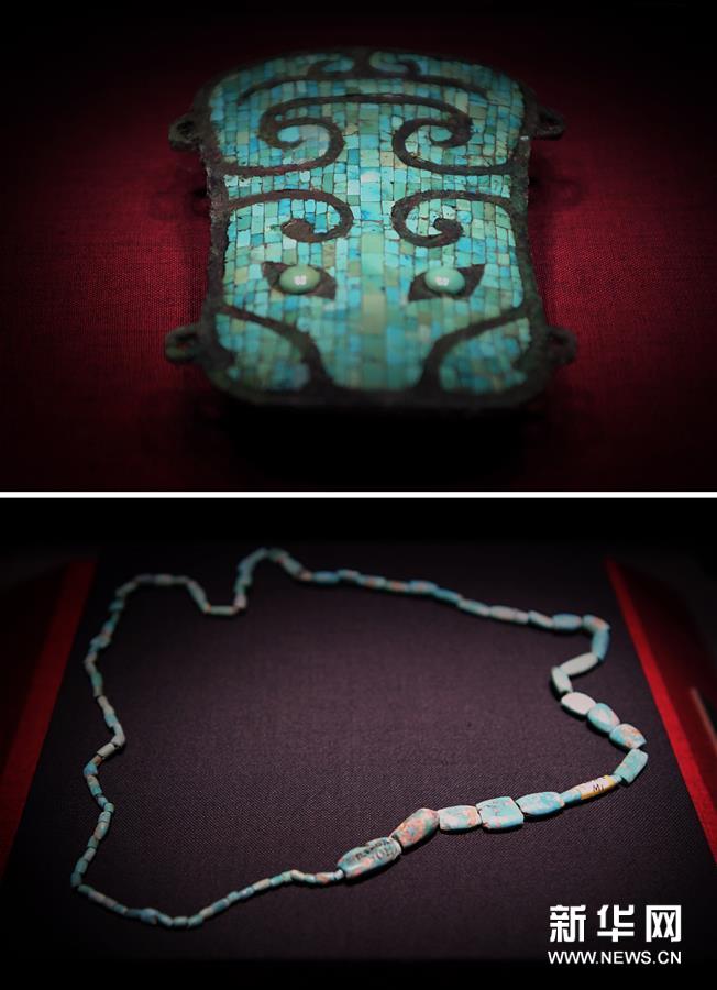 这是2019年10月19日在二里头夏都遗址博物馆内拍摄的“镶嵌绿松石兽面纹铜牌饰”(上)和“绿松石串珠”(下)(拼版照片)。新华社记者 李安 摄